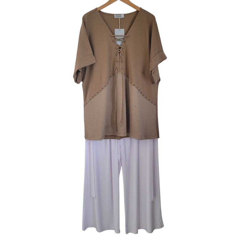 - Tunique : Camel coton polyester, ample, col V, manches courtes amples