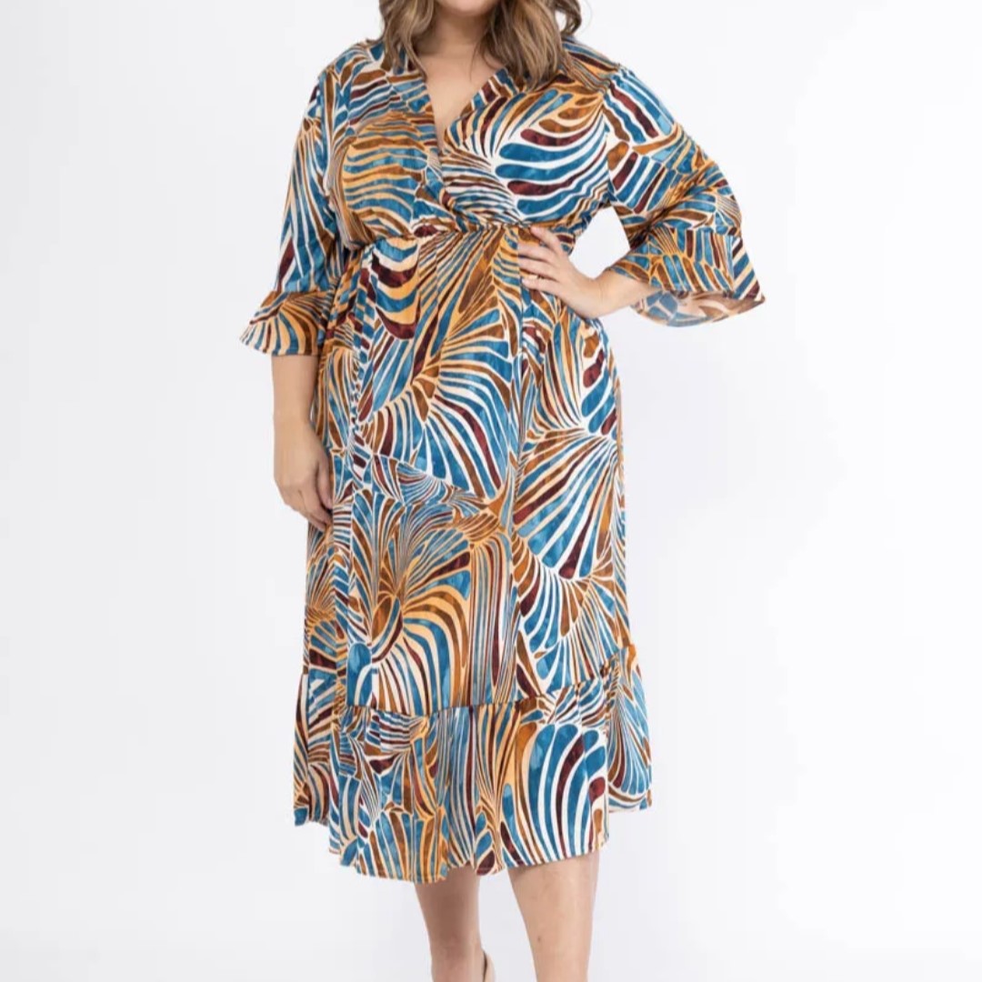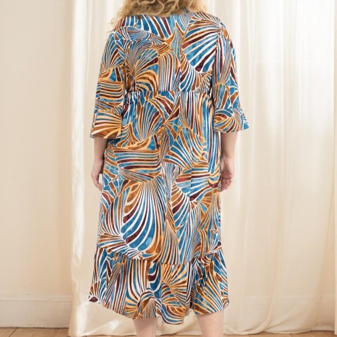 Robe mi longue trapèze à imprimé manches courtes évasées à volants