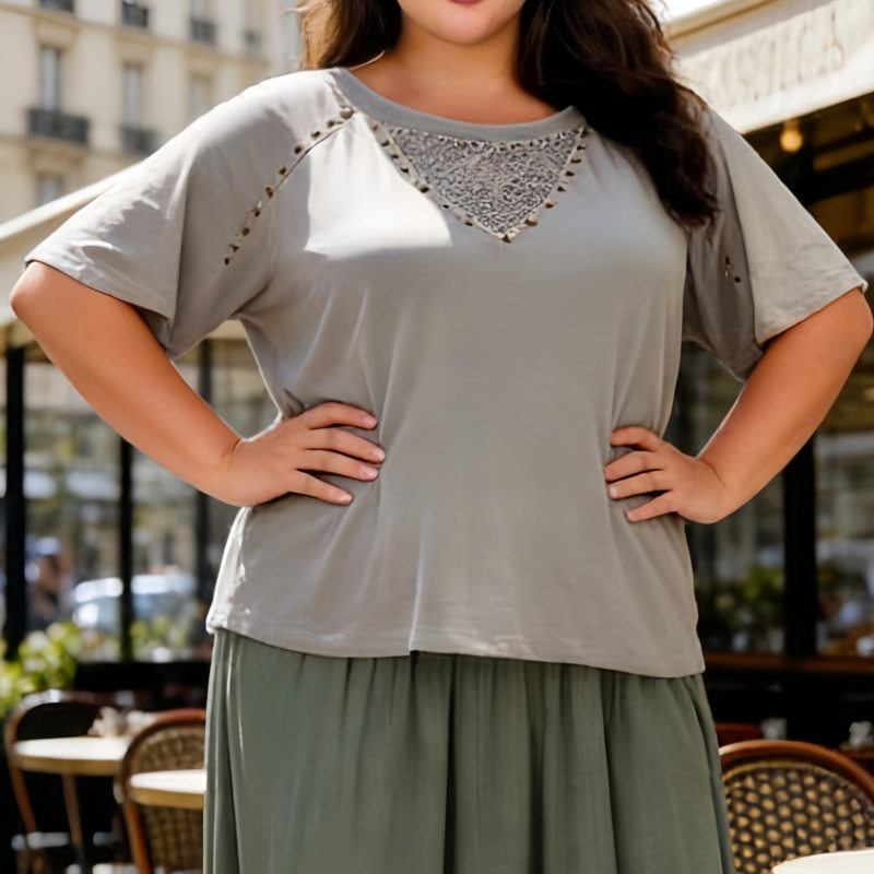 Adopte un style frais et raffiné avec ce tee shirt femme manches courtes en coton stretch. Sa délicate finition en dentelle au col sublime ton port de tête tout en t’offrant un confort absolu. C’est l’atout idéal pour un look casual chic qui valorise tes courbes avec douceur. Découvrez tous nos tshirts femme ronde pour plus de féminité