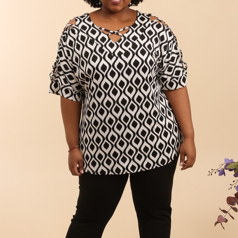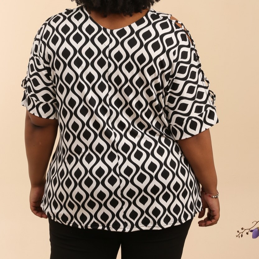 Haut pour femme, un modèle en noir et blanc conçu spécifiquement pour les grandes tailles. La coupe est étudiée pour flatter la silhouette : sa matière fluide et légère offre un tombé impeccable, masquant subtilement les rondeurs sans les mouler. haut femme grande taille à la fois élégant et confortable, idéal pour toutes les occasions.